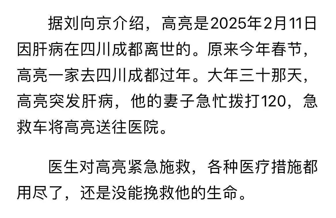 据刘向京说,今年高亮全家选择到四川成都过年,这原本是件开心事,没想到大年三十,高亮突发肝病,立马送往医院接受治疗,所有的抢救措施都用了,依然没能留住他的生命。
